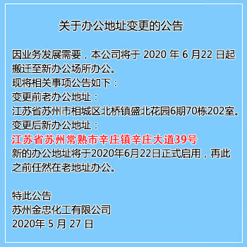 蘇州金忠化工有限公司成立于1995年元月,位于人杰地靈、山清水秀的蘇州市相城區(qū)。而生產(chǎn)工廠則位于國家級化工園區(qū)-蘇州常熟市新材料產(chǎn)業(yè)園區(qū)。 園區(qū)水、電、汽設(shè)備配套齊全。生產(chǎn)工廠占地面積70,000m2,擁有標(biāo)準(zhǔn)廠房50,000m2,2002年通過了ISO9001國際質(zhì)量體系認(rèn)證。